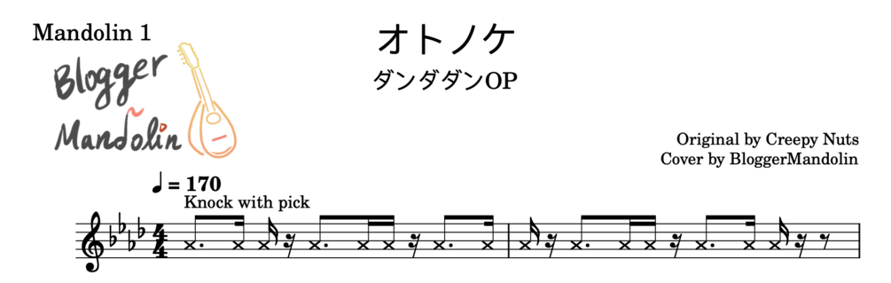 これは、アニメ『ダンダダン」OPテーマ『オトノケ / Creepy Nuts』のマンドリン練習用楽譜です。