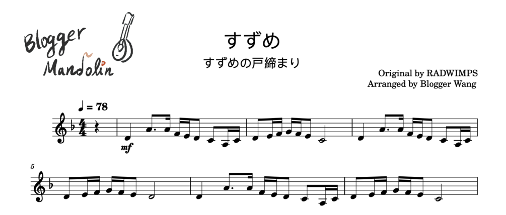 這是新海誠動畫電影「鈴芽之旅」的主題曲–「Suzume/鈴芽」的曼陀林主旋律練習樂譜PDF(附曼陀林演奏輪音方法說明)